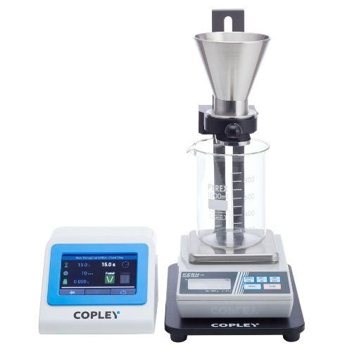 By adding a balance and a timer linked to a micro-switch located on the shutter mechanism, it is now possible to conduct time vs mass tests using either cylinder or funnel methods without the need for an external stopwatch.