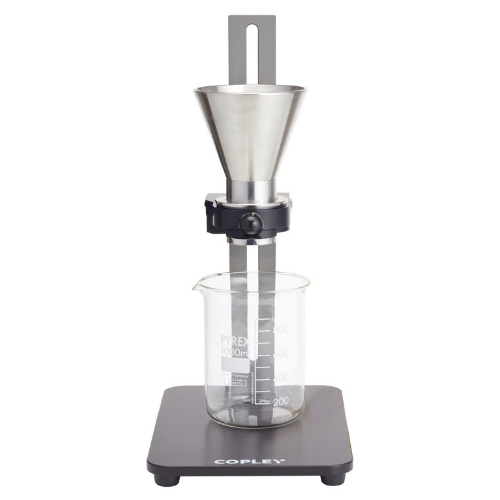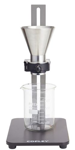 ![]() | The funnel attachment is based on the stainless steel flow funnel and nozzle described in the USP <1174> and Ph. Eur. Chapters 2.9.36 and 2.9.16 for Flowability. It has a capacity of approx. 400ml. The attachment is supplied with three nozzles corresponding to aperture sizes of 5, 7, 10, 15 and 25 mm respectively. Both funnel and nozzles are manufactured from Pharmaceutical grade 316 stainless steel. The nozzles can be quickly interchanged using the connecting nut provided for that purpose. The opening at the bottom of the funnel is secured by means of an adjustable shutter which is closed during the filling operation. The test is carried out in a similar manner to that of Method A (Mass vs Time) of the cylinder attachment. The addition of our Balance/Timer Attachment to the shutter mechanism simplifies Mass vs Time tests. |